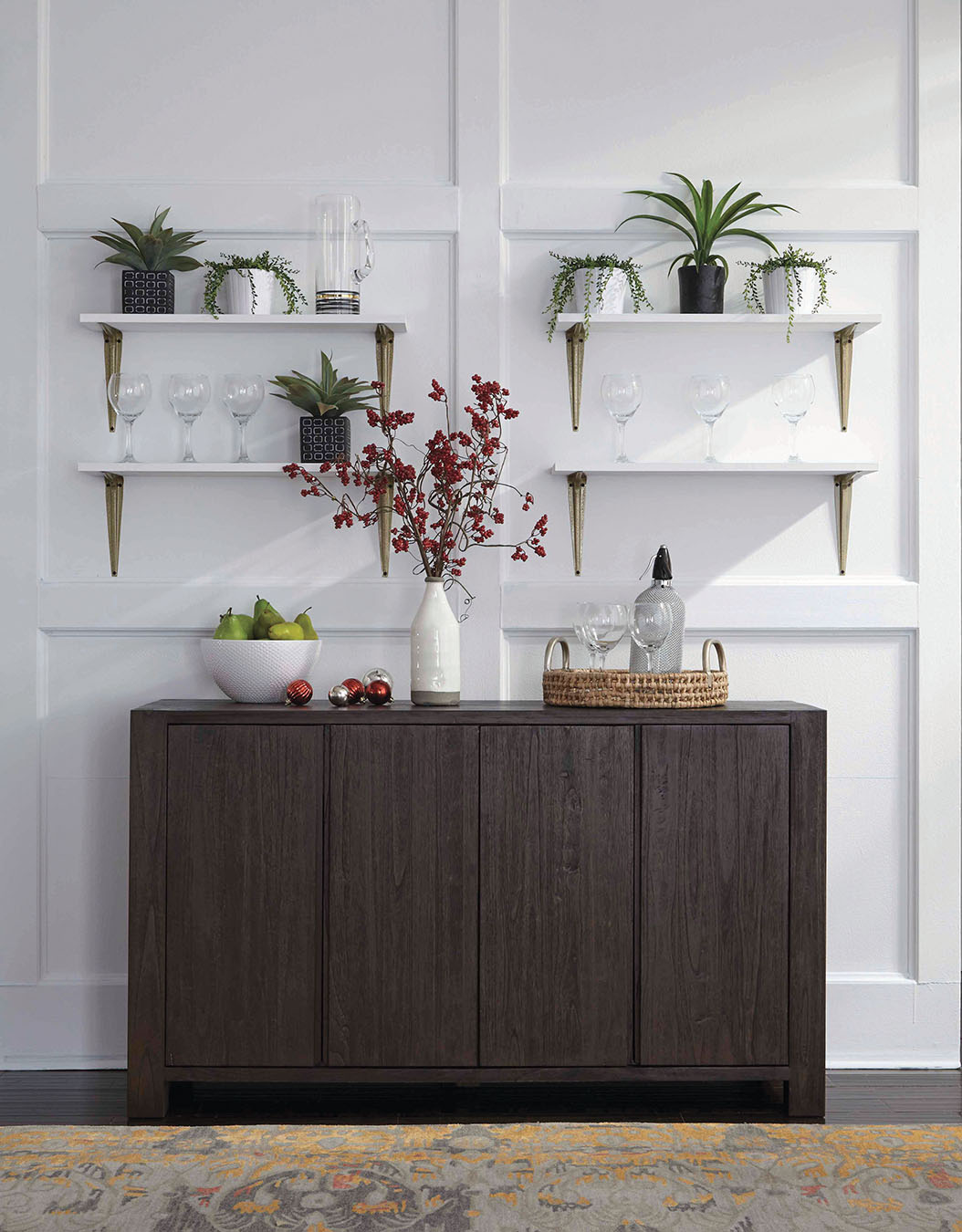 By pairing classic white tableware with neutral linens and natural elements like artichokes or green leaves, you'll establish an eye-pleasing contrast, like below in the Farmington tabletop. And especially as New Year's approaches, don't be shy about adding some glam, via glitzy or metallic-coated accessories. Display cabinets can carry through your tabletop theme, and more color can be added with wall art, like the Sprout Artwork.