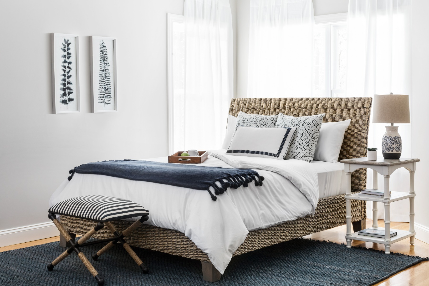 Layering your rugs is an easy and fun way to add dimension, depth, and contrast to your space. A general rule for layering rugs is to keep the larger, bottom rug a more neutral color , and let your smaller rug on top add the pattern, brightness, or nuance. Don’t be afraid to combine different textures and styles as well! A white, boucle rug with a striped blue and white rug atop can combine natural and nautical for a cozy and interesting look. Don’t get too carried away with colors, though. Combining too many different patterns and styles can be overwhelming and off-putting.