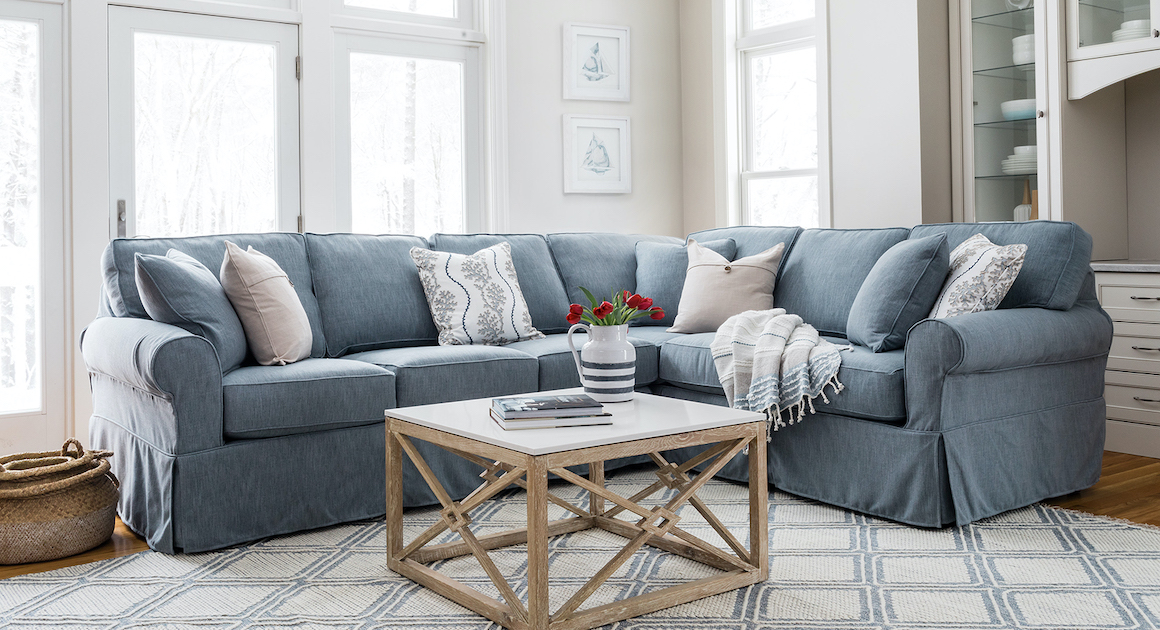 Relaxed and stylish, the coastal favorite Fairbanks is shown here as a sectional in a beautiful blue slipcover, but you can customize with hundreds of fabric options.